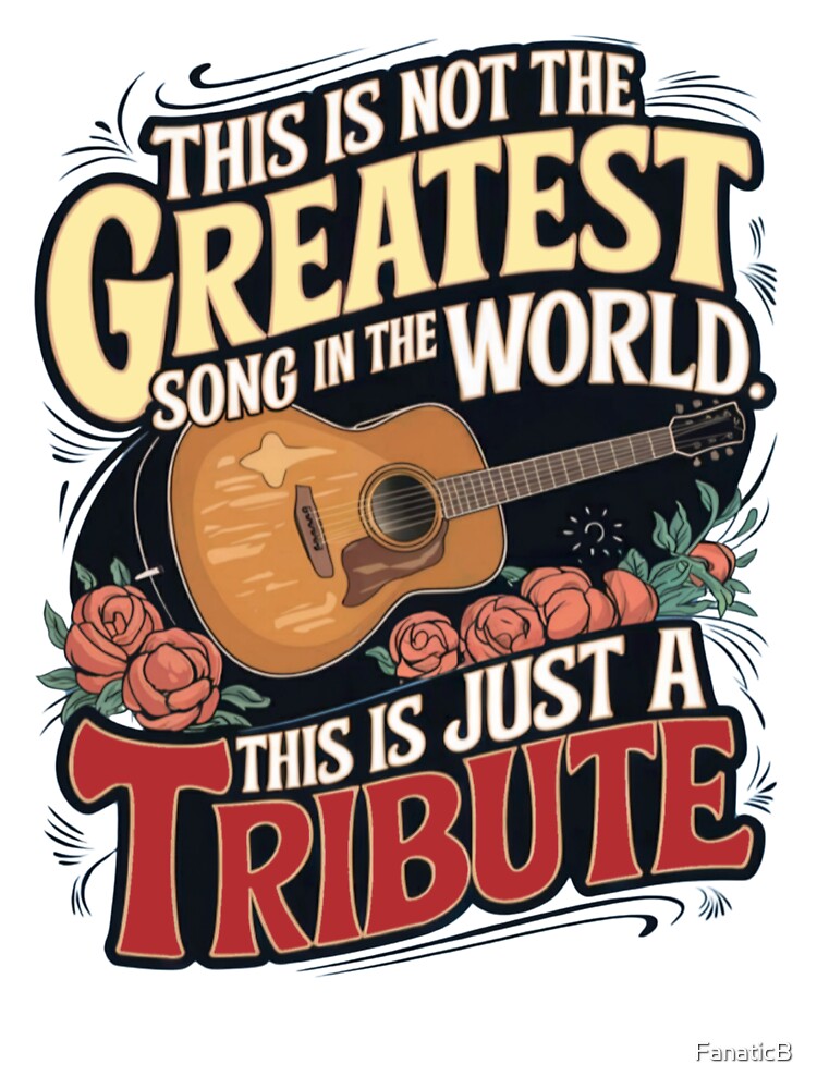 A graphic featuring an acoustic guitar surrounded by red roses and black decorative swirls. The text at the top reads “THIS IS NOT THE GREATEST SONG IN THE WORLD.” Below the guitar, the text continues “THIS IS JUST A TRIBUTE.” The overall style is illustrative with a vintage feel, and the phrase “FanaticB” is in small text at the bottom right.